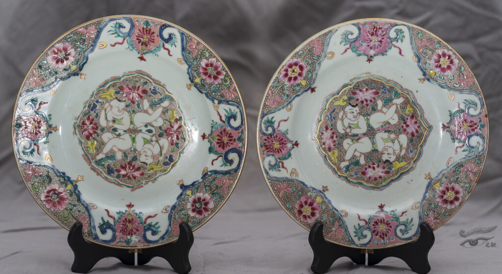 23. Pair of Famille Rose Plates 18th Century 雍正粉彩和合二仙盘一对