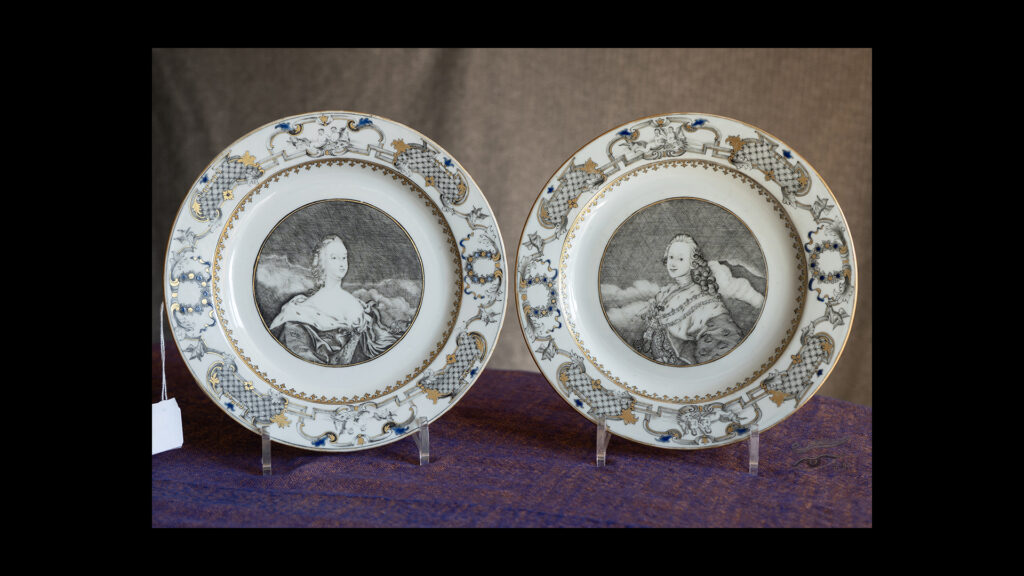 359. PAIR OF GRISAILLE AND GILT ROYAL PORTRAIT PLATES, King Frederick V (Denmark and Norway) and Queen Louise, Qianlong period, around 1750.
