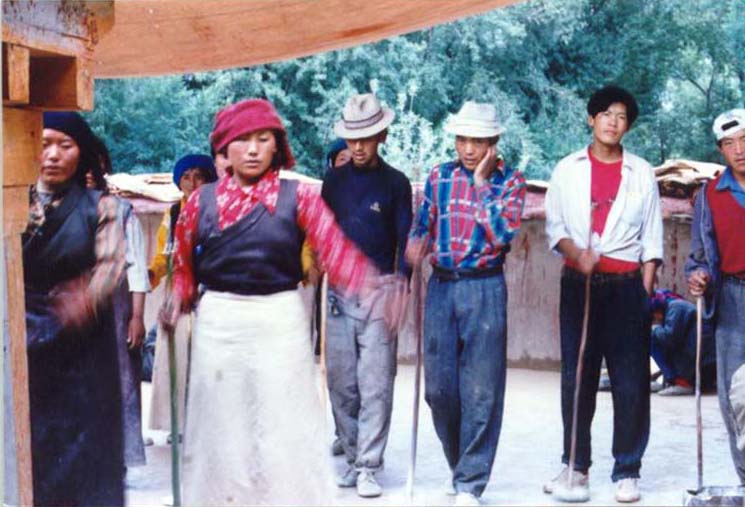 8月11日,起床后先给桑珍一家照相,看得出他们家并不富裕,但陈设古朴整洁,是典型的藏族人家。他们又拿出两件藏袍给我们穿来照相,自以为俨然一个藏民,但后来看照片却一点不象。然后小桑珍陪我们去赛马场,今天是在体育场内进行举大石、拔河、骑牦牛比赛。我们到时举大石已经开始,但一般观众只能远远地在看台上看,只有那些挂着所谓“记者证”的人才能进入场内,当然也有一些藏民溜了进去。不过这点小困难是难不住我们的,对那些当兵的一阵连哄带骗,就溜进了场内。可惜桑珍胆子太小,我们叫她进来她却不敢。