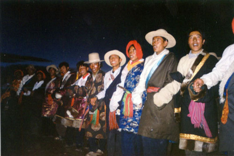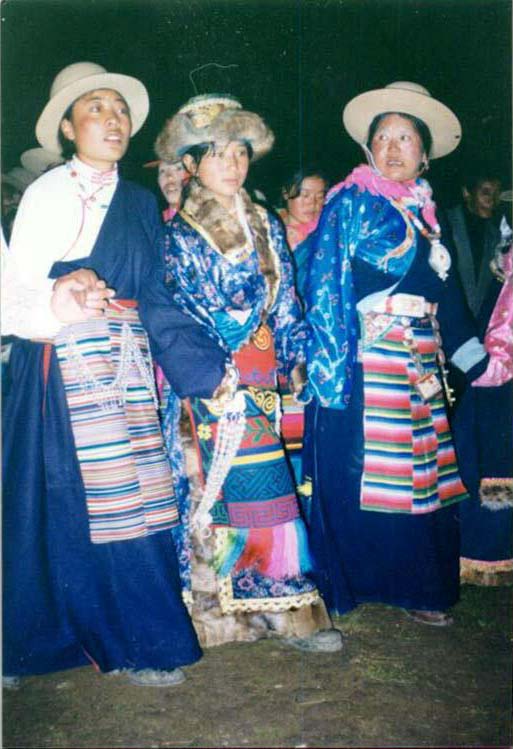 天色渐黑,人们开始进入体育场点起篝火歌舞。这时我的胶卷已经用完,拍不了照了,突然觉得他们的歌声非常好听,不录下来太可惜了。于是我二话没说,手电筒也没拿,冒着再次被狗咬的危险摸黑回桑珍家拿录音机。终于拿来了录音机,可是因为路程太远,我又不太熟悉,走了过多的时间,篝火已快熄灭,歌舞者已渐渐散去。而且,我找不到桑珍母女和我的伙伴了。正在这时,广播里传来了我的名字,原来是聪明的拉珍到广播室喊我了。我连忙赶到主席台,找到了他们。正当我有些沮丧的想离去时,拉珍忽然叫起来:“有歌声!”果然,远处草原上隐约地传来了歌声。我们循声觅去,看到一群年轻的藏族男女,仍在不知疲倦地歌舞。母女三个也加入了进去,我则一手拿着录音机,蹲在圈子的正中为他们录音。藏人真是天生的歌舞家,他们从下午跳到黄昏,从黄昏跳到天黑,现在篝火已灭,他们仍在忘情地歌舞。而且舞步丝毫没有放慢,歌声一点没有变轻,尤其是那些年轻奔放的姑娘,甚至让你担心自己的耳膜被她们的歌声刺穿。这是多么令人羡慕的一个民族!这时我又发现了一个有趣的风俗,有许多小伙子站在圈外,并不跳舞,他们只是注视着圈内歌舞的姑娘,等姑娘跳到跟前,突然把姑娘拽出圈外。有的姑娘不愿意,又跑了回来,有的却没有回来,据说很可能姑娘和小伙就这样结成了夫妻。快到十一点,我们才回到桑珍家。