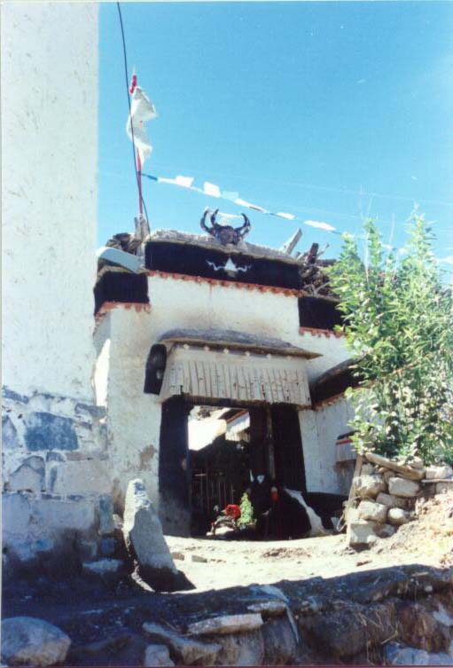 回到旅馆,庞永江也感到不太舒服,蒋洪也懒得动弹,段洪独自去了扎什伦布,我只好一个人出去逛,先到了近郊山脚下的一个村落,立即被那古朴的民居,幽静的巷子,以及那些用来装饰的牛角经幡所吸引。于是一边拍照,一边越走越深,忽见一条白狗不紧不慢地跟着我,个头不大,想到扎什伦布寺中那一只只睡态可拘的狗,便无所畏惧地继续前行。正当我拍下一张门口卧着一头牛,门上摆着一个牛角的非常有意思的照片,那狗从我背后的高处冲了下来,咬了我小腿肚子一口,然后满脸无辜地小声哼叽着夹着尾巴钻进一个石板缝里。真是哭笑不得。撩起裤腿,只伤了些皮,但两排齿印,尤其是两个犬齿还是非常明显的。