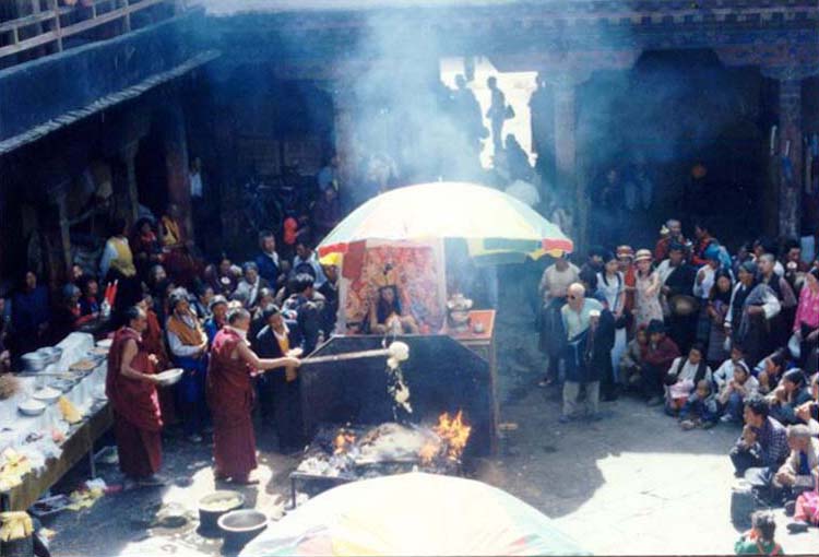 还看到了喇嘛的法事,一个看上去象活佛的喇嘛坐在院子中间的遮阳伞下,其余的人围着他念念有词,又有喇嘛用一根长勺似的东西舀着酥油烧,没有多看,实在不懂这仪式有何意义。