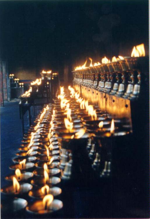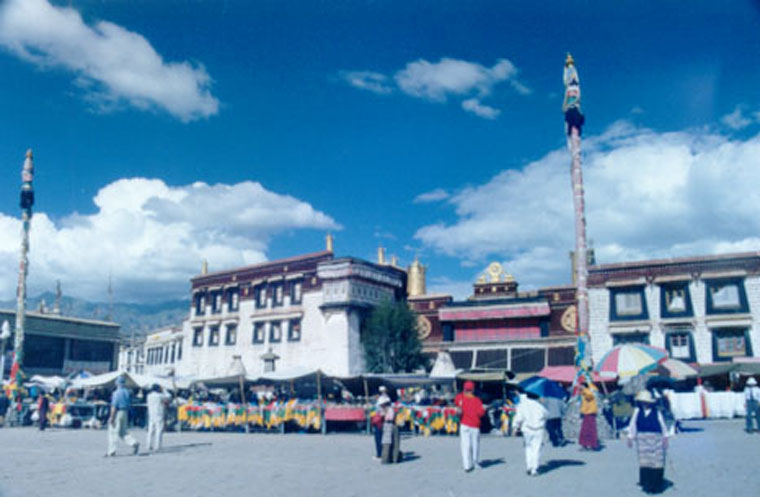 接着,我们去了大昭寺。大昭寺前排满了卖各种各样小玩艺的摊子。许多走动着兜售商品的小贩,大都是些年青的姑娘。在以后的几天里,正是因为和这些小贩的交往使我成了讨价还价的高手。有时你会觉得和这些小贩讲价简直是一种享受,尤其当你的对手是一个漂亮的藏族小姑娘,甜甜的对你说:“叔叔,看一看嘛!”的时侯。