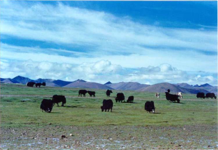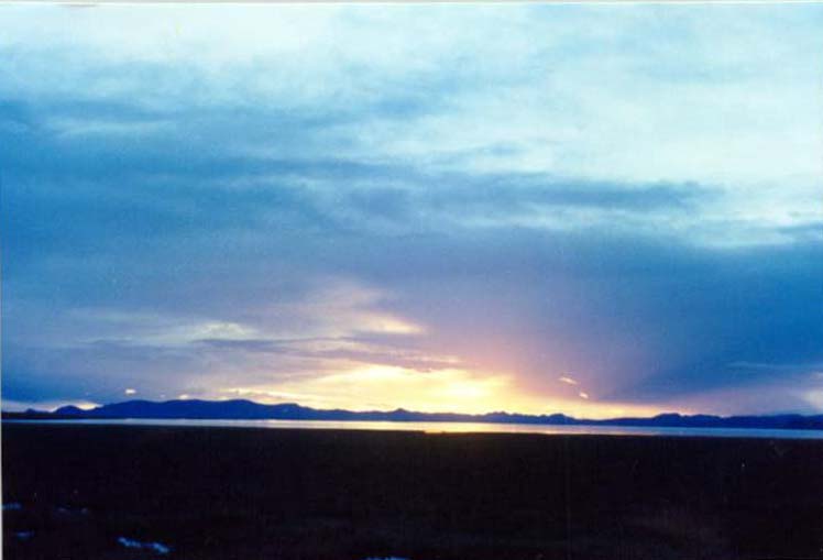 过了山口便很快到了那木错边的草原,不时能见到成群的牛羊和牧人的帐篷。虽然都九点多了,太阳仍悬在西边天水相交的地方。东边的天已经有些昏暗,绿色的草地伸延过去是一带蓝色的山,再往后,几座白的有些刺眼的雪山探出了头,上面是灰蓝的天,月亮象个幽灵的影子般升了起来,心中蓦然间有一种被深深刺痛的感动。再看西边,太阳渐渐接近了天水相交的地平线,那里似乎有一带窄窄的蓝紫色的远山,却没有雪山,上边是五彩的祥云,也许神湖那木错的神仙们正在这些祥云上聚餐吧。天地间是如此的广阔,你环顾四周到处都是令人留恋的景色,无法再写下去了,现在似乎又回到了那个黄昏的神湖之畔,连呼吸都将停止。