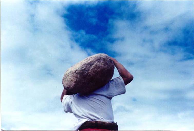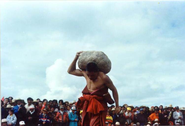 只见一个膀大腰圆的喇嘛弯腰抱住一块大石,沿着小腿滚到了膝盖以上,然后蹲下来把石头放到大腿上,再不停地扭动身子慢慢往身上滚,这是力量与技巧的完美结合,甚至让人感觉象是一种舞蹈。当把大石滚到胸前的时候,最关键的时刻到了——前边的几个人都是到了这个时候功亏一篑。只见大喇嘛右手托石,左手使劲一撑,把石头稳稳地放在了肩膀上——成功了!全场掌声雷动。大喇嘛又扛着石头绕场三圈,才把石头从后面扔到了地上。石头的重量不断加重,不断有人被淘汰出局。当石头的重量加到330斤时,只剩下四个人了,两个牧民,两个喇嘛。我是很希望那个虎背熊腰,浓眉大眼的牧民小伙子能得冠军的,但事与愿违,最后一个喇嘛得了冠军。西藏的喇嘛都是酒肉和尚,生活富裕,平常没事练练力气,没准还有什么密宗武功,得了冠军也不足为奇了。