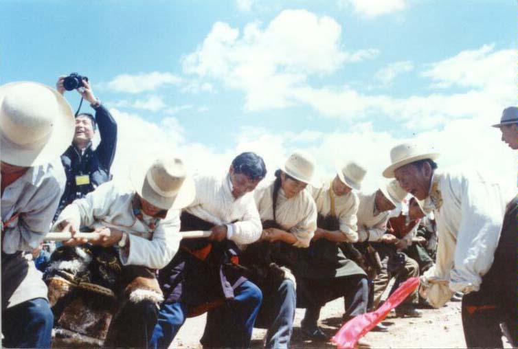 接下去进行拔河比赛,也异常精彩激烈。挥舞着旗子呐喊助威的藏人,躺在地上用身体拖住绳子的喇嘛,上窜下跳的老记,那些我听不懂的加油的叫喊,都令我记忆尤新。