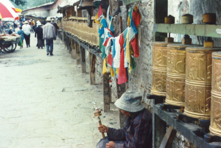 中午近两点,离开了布达拉宫,又绕着红山走了一段。环绕红山的这条路实际上是一条转经廊,据说有好几千个经轮,善男信女们手拿着转经筒一圈圈地走着,和着淡淡的酥油香,伴者喃喃的祈祷,涤去前生的罪孽,希翼着来世的幸福,就这样一圈圈地走着。我被这场景深深的感动,不禁驻足为他们祝福。