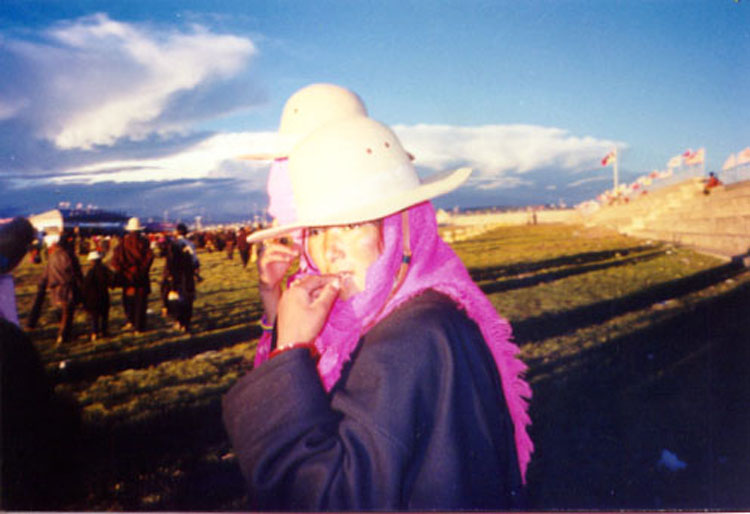 上午的比赛到此结束,中午回桑珍家吃饭。下午给阿旺次仁做风筝,然后上街打听到格尔木的班车,结果没有,看来只好又搭便车了。顺路去了孝登寺,据说是藏北名寺。但没有开门,只在门口照了一张老太太磕长头的照片。这时天气突变,下起了小雨。这可如何是好?晚上的舞会要泡汤了。于是我赶紧开始求达赖喇嘛显灵,可是直到回到桑珍家,雨还没有停。母亲和大女儿拉珍,还有桑珍已经穿戴整齐,望着阴雨的天犯愁。谁知过了十几分钟,雨居然停了,又过了几分钟,太阳都出来了,看来达赖显灵了。当我们走到草原的时候,天上已经几乎没有云了。西藏的天就是这样,经常一天中阴晴变换好几次。