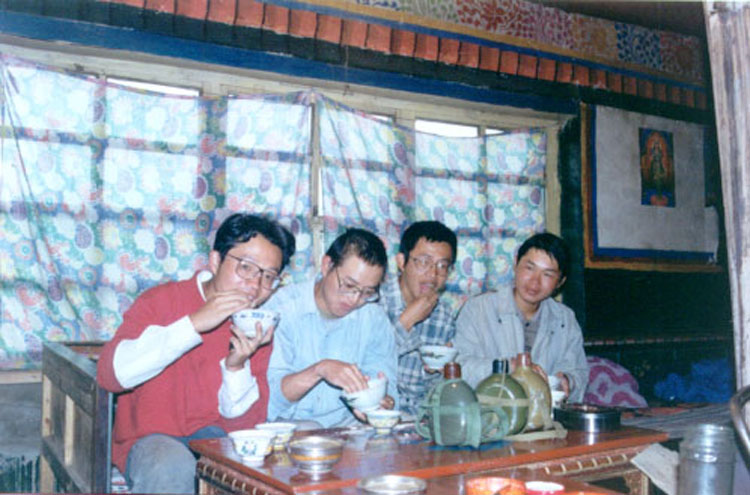 于是我们开始盘算搭北大人的车同去念青,又多半能看那木错。到军区第二招待所,居然没有三人间了,于是找老板娘借了被子,索性找北大人住的旅馆住了进去。但当我们提出想搭车的愿望时他们却表现的很冷淡。这时出现了分歧,我们几个想先到念青,然后如果有可能再绕过念青去那木错。但庞永江却坚决反对,他担心到念青后去不了那木错,想先比较保险的到那木错,再在湖边远远地看念青就行了。最后我们还是决定先到那木错,这样便也不必再找北大人搭车了。