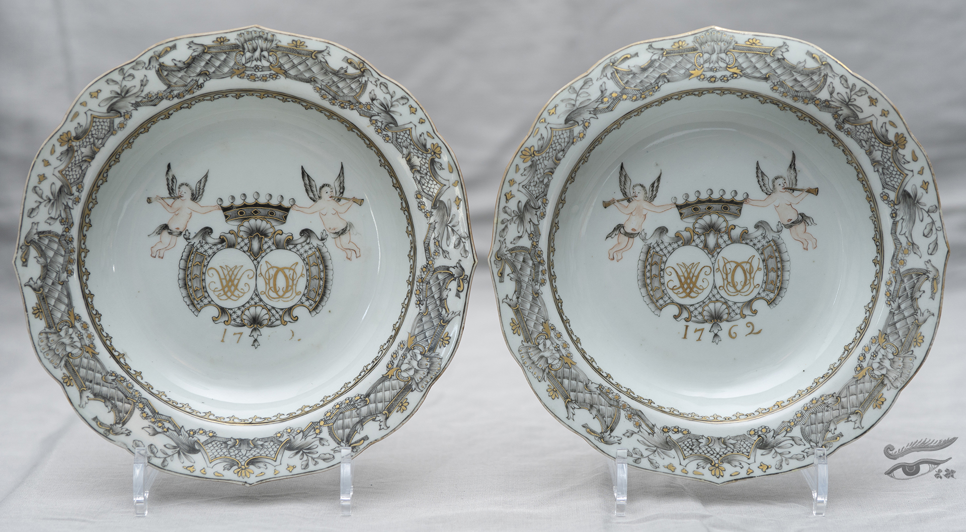 55. Pair of Chinese Armorial Porcelain plates 18th C 乾隆墨彩描金维也纳皇家纹章盘一对 September 7, 2022January 17, 2024 lhasa.hou@gmail.com In grisaille and gilt heightened, dated 1762, the well with the monograms of the couple and flanked by cherubs, the lobed rim decorated with a design inspired by the royal Vienna porcelain.