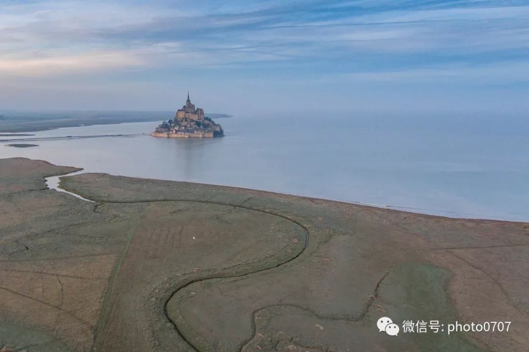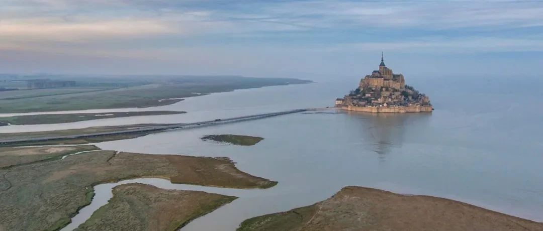 圣米歇尔山在法国北部诺曼底大区的西南部,是一座位于库斯农河(Fleuve du Couesnon)河口以东960周长的花岗岩岛屿。小岛由一条长堤与大陆相连,落潮时经常被大片沙滩包围,只有涨潮时才成为岛屿。
