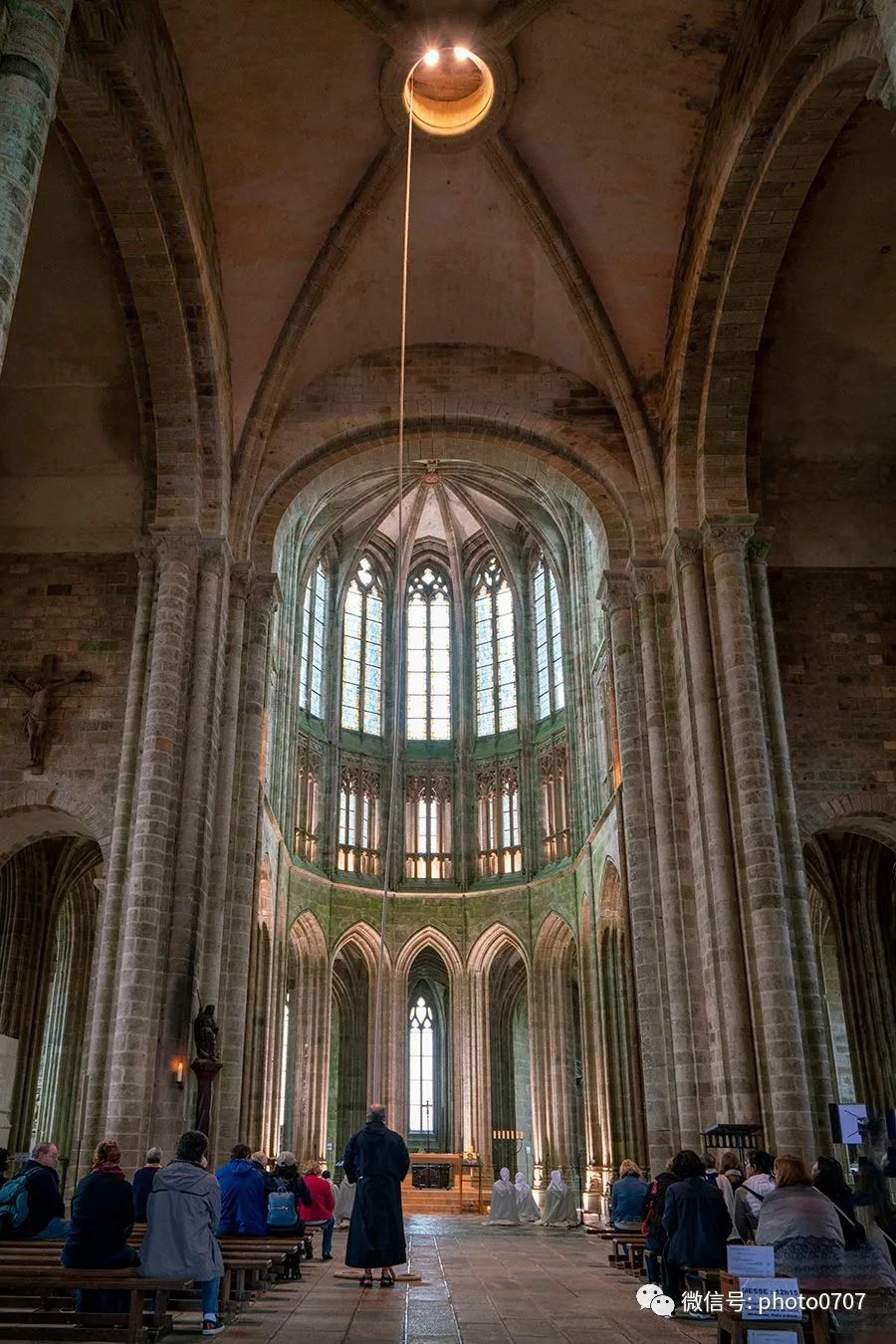 教堂内部,一位修士通过一条长绳敲打顶端钟楼的大钟。