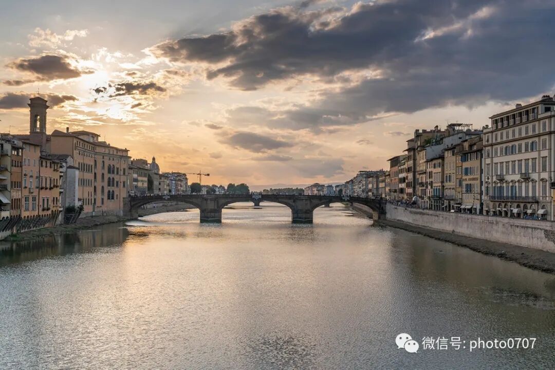 从佛罗伦萨最古老的恩宠桥上,眺望落日余晖下的老桥。